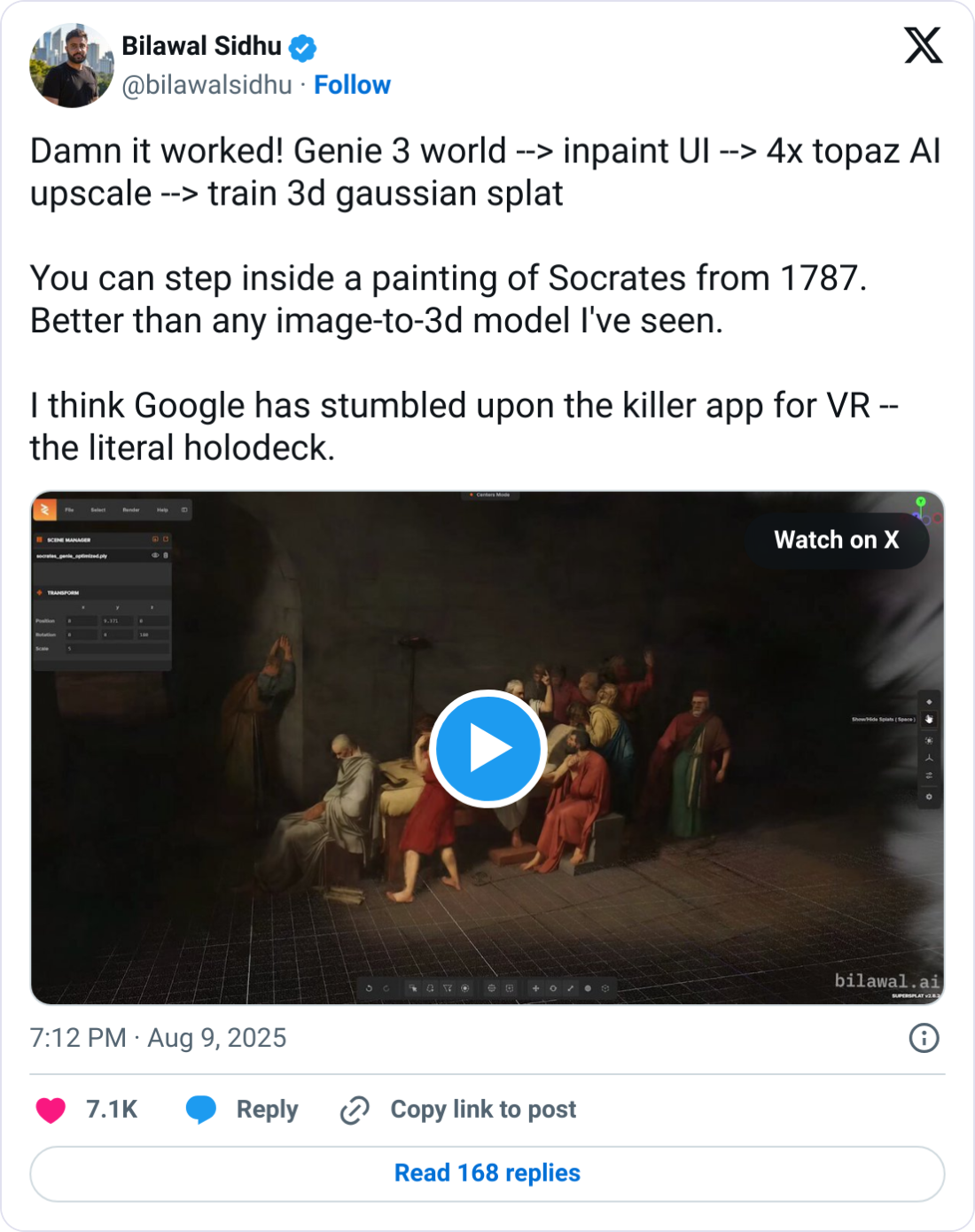 This combination merges the best of both approaches: the realtime speed and creative power of Genie 3 with the portability and editability of NeRFs/Splatting. I’ve seen Bilawal experimenting with something like this.
