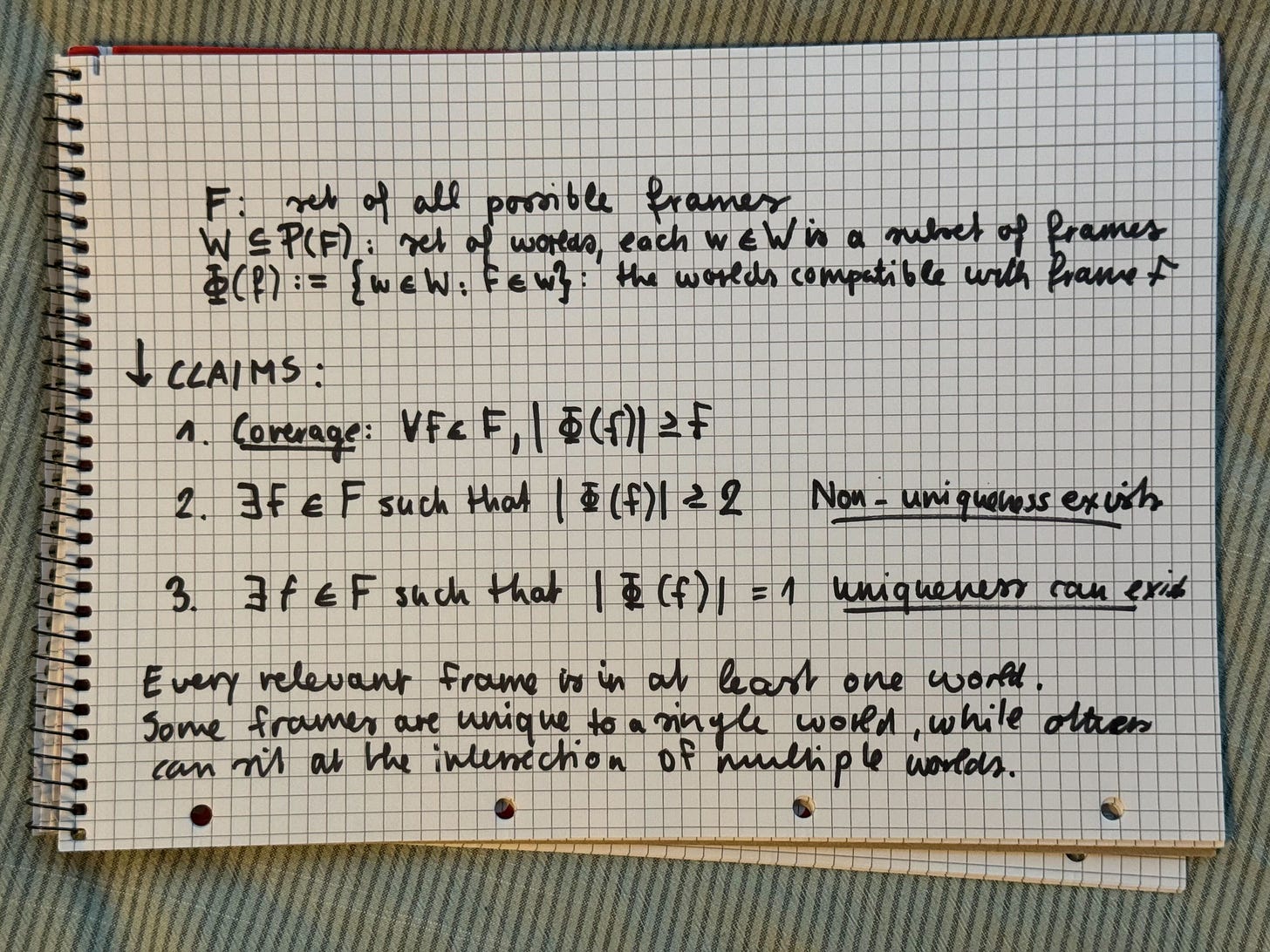 Some frames are unique to one world, but others anchor multiple plausible worlds.